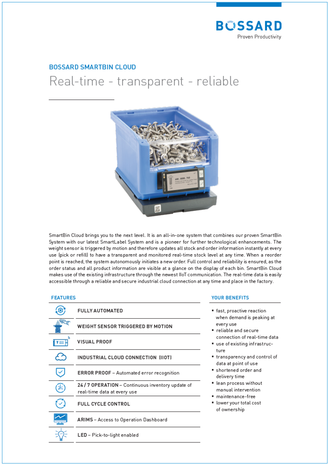 - SmartBin Cloud erkennt Nachfüllungen automatisch und garantiert, dass das Material am richtigen Ort wieder aufgefüllt wird.