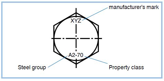 Nuts from minimal diameter M5 must be marked with the steel group, the property class and the manufacturer’s mark.