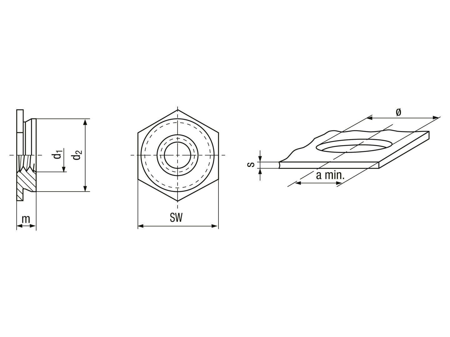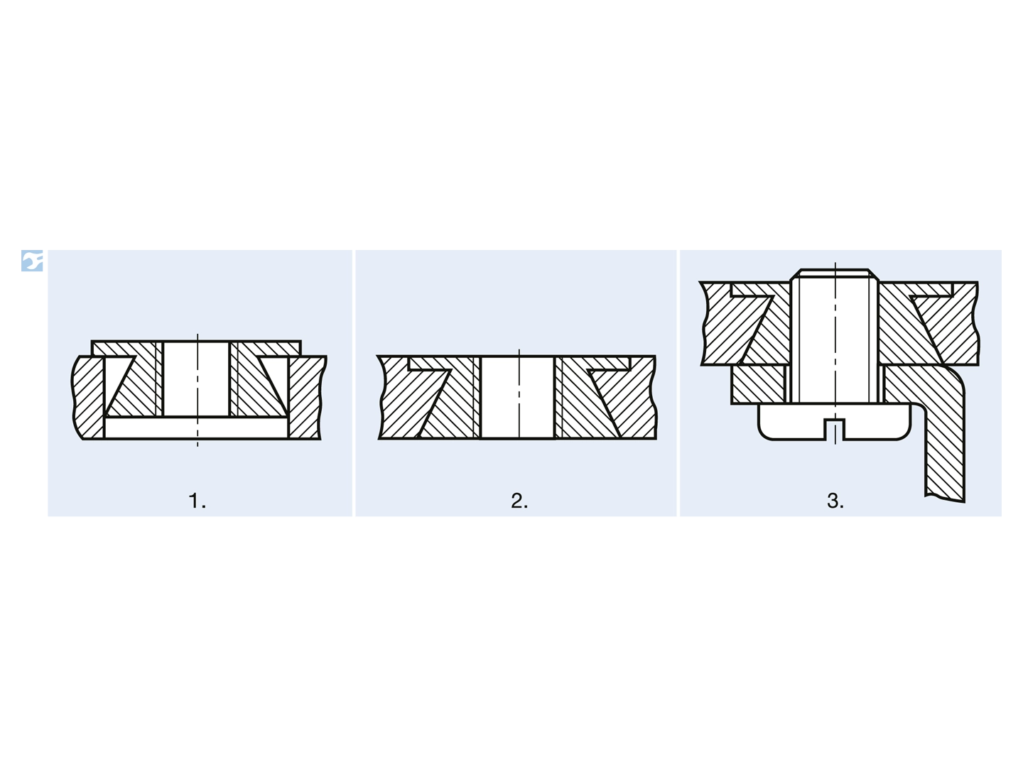 Für Bleche bis max. Härte HRB 70. Für Neukonstruktionen Abmessung M3 empfohlen. Speziell für dünne Aluminiumbleche geeignet. Nach der Montage beidseitig nicht überstehend.Montage