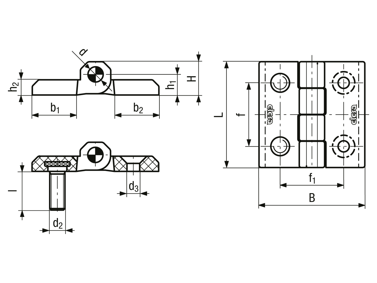 Scharniere mit Gewindebolzen Stahl vernickelt und Durchgangsbohrungen für Senkschrauben