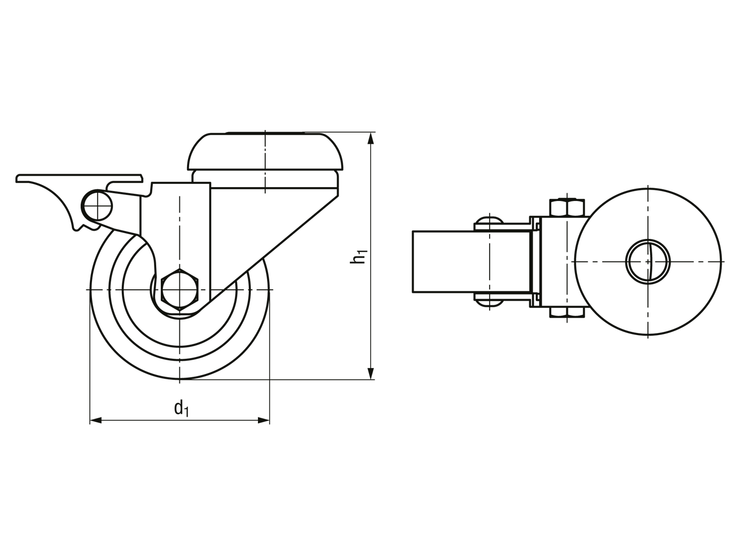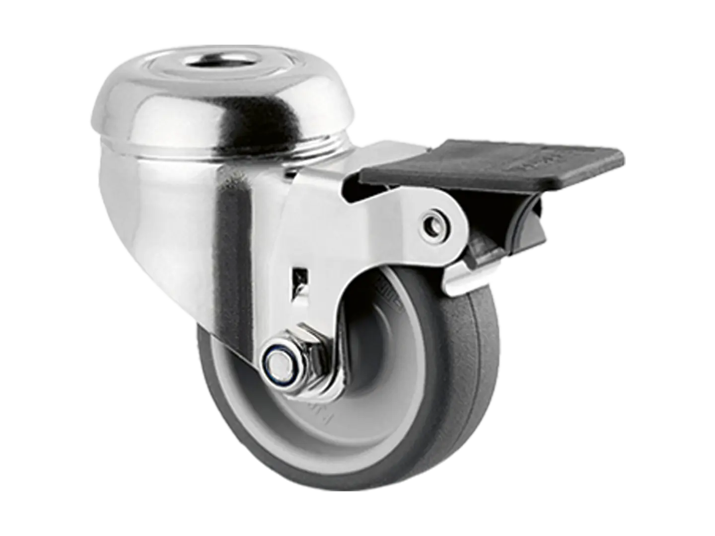 Housing made of Stainless Steel, double ball bearing swivel head, wheel axle with nut, brake pedal made of Polyamide, bolt hole