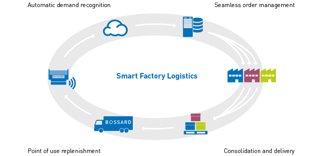 - Bossard puts the flow of goods together and produces a consolidated invoice. Delivery is either to the point of use or to the goods receipt point.